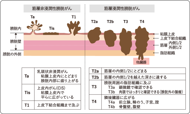 初期のうちは膀胱の内側にとどまっていますが、進行すると筋層の深くまで広がったり、リンパ節や他の臓器に転移したりすることもあります。