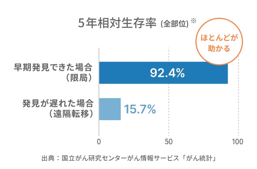 がんは、早期発見によって生存率が大幅に高まり、完治する可能性も上がります。