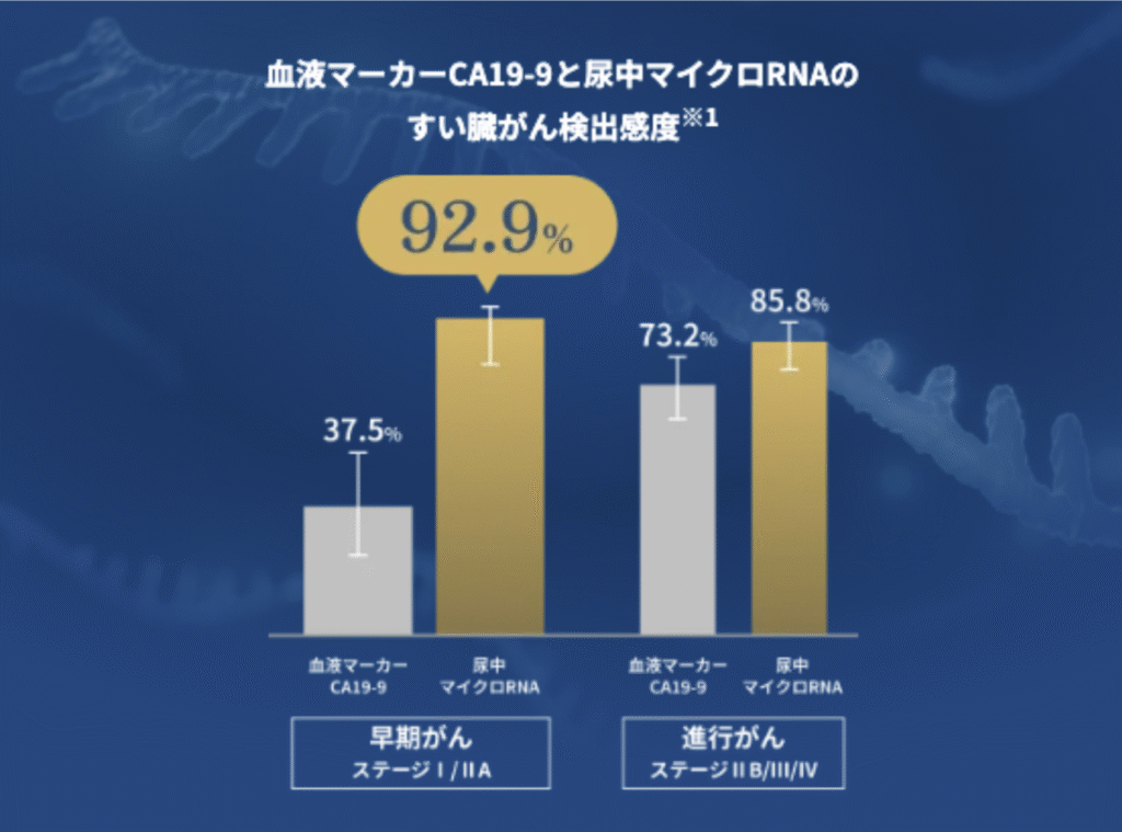 健康診断でよく用いられるCA19-9の感度37.5%と比較しても、尿中マイクロRNA検査の検出性能が優れていることが明らかとなりました。