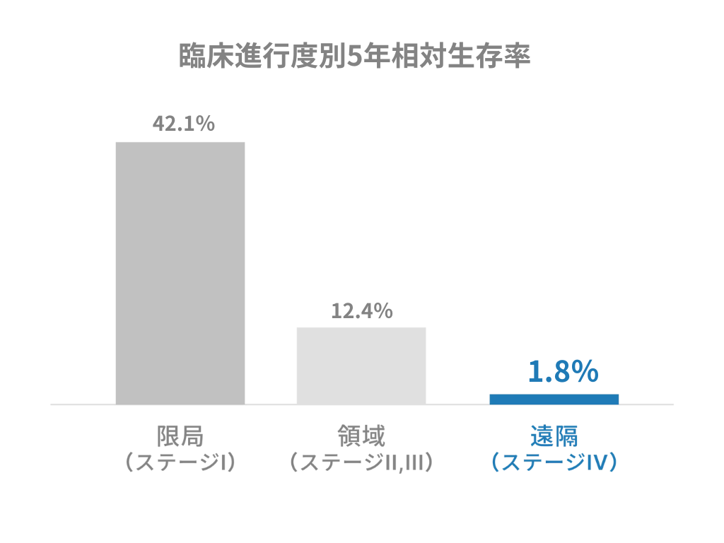 がんが膵臓内にとどまるステージⅠで発見された場合の5年相対生存率は42.1%ですが、遠隔転移を伴うステージⅣでは1.8%まで低下します。