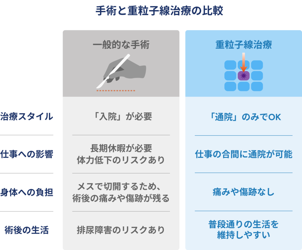 - 早期発見できたからこそ、手術ではなく通院で済む「重粒子線治療」を選択。仕事への影響を最小限に抑えられた。